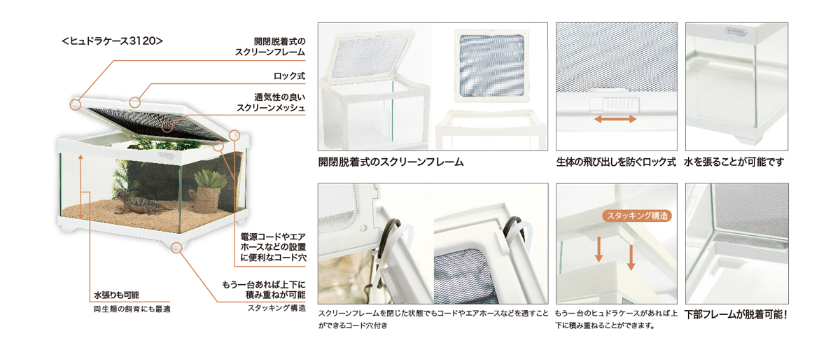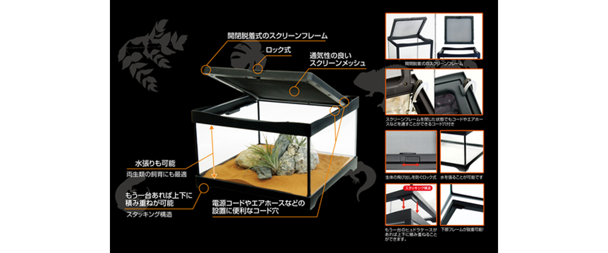 ケージ外に設置するので、レイアウトを自由に楽しめるだけでなく、生体・飼育者のヤケドも予防します。