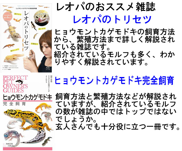 ヒョウモントカゲモドキの飼育方法からブリード方法などが記載されています。