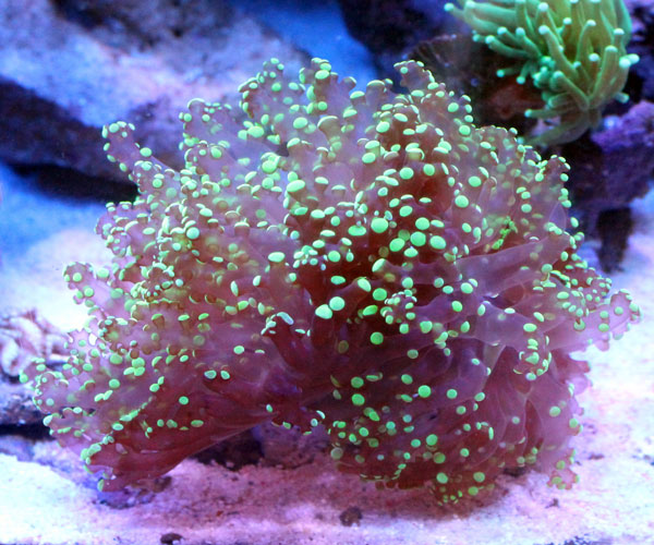 レッド&グリーンのフラワーロックアネモネです。すごくキレイな上に、とても丈夫で飼育が容易な種類です。水流は弱めでも飼育可能です。あまり動かないイソギンチャクです。