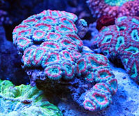 レッド&グリーンの、とても美しいカクオオトゲキクメイシです。平板状の個体です。